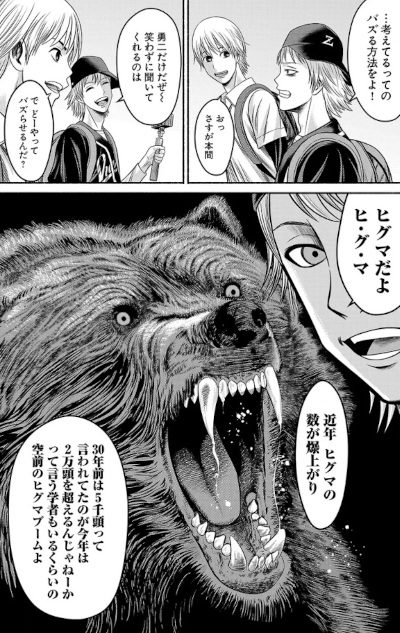 Trama: Yuji e i suoi compagni del terzo anno di università decidono di andare in campeggio a Hokkaido. Durante la gita, tra i tanti argomenti toccati, si parla dell'aumento della popolazione di orsi bruni nella regione. Si spera di vederne uno, ma da quando si realizza quel desiderio, i ragazzi si trovano in costante pericolo.