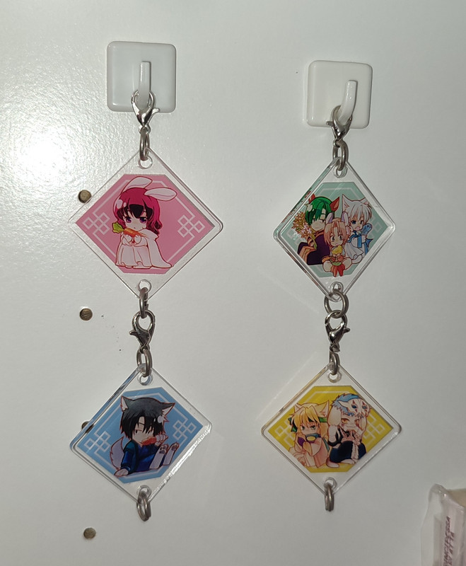 Ti lascio allegati le foto di quelli che ho io (trovi i link nelle parole associate). Purtroppo dei portachiavi ho proprio quelli usciti su rivista giapponese, ma mi sembra che siano identici, comunque ti lascio la foto del post della casa editrice (e nel dubbio anche i miei).