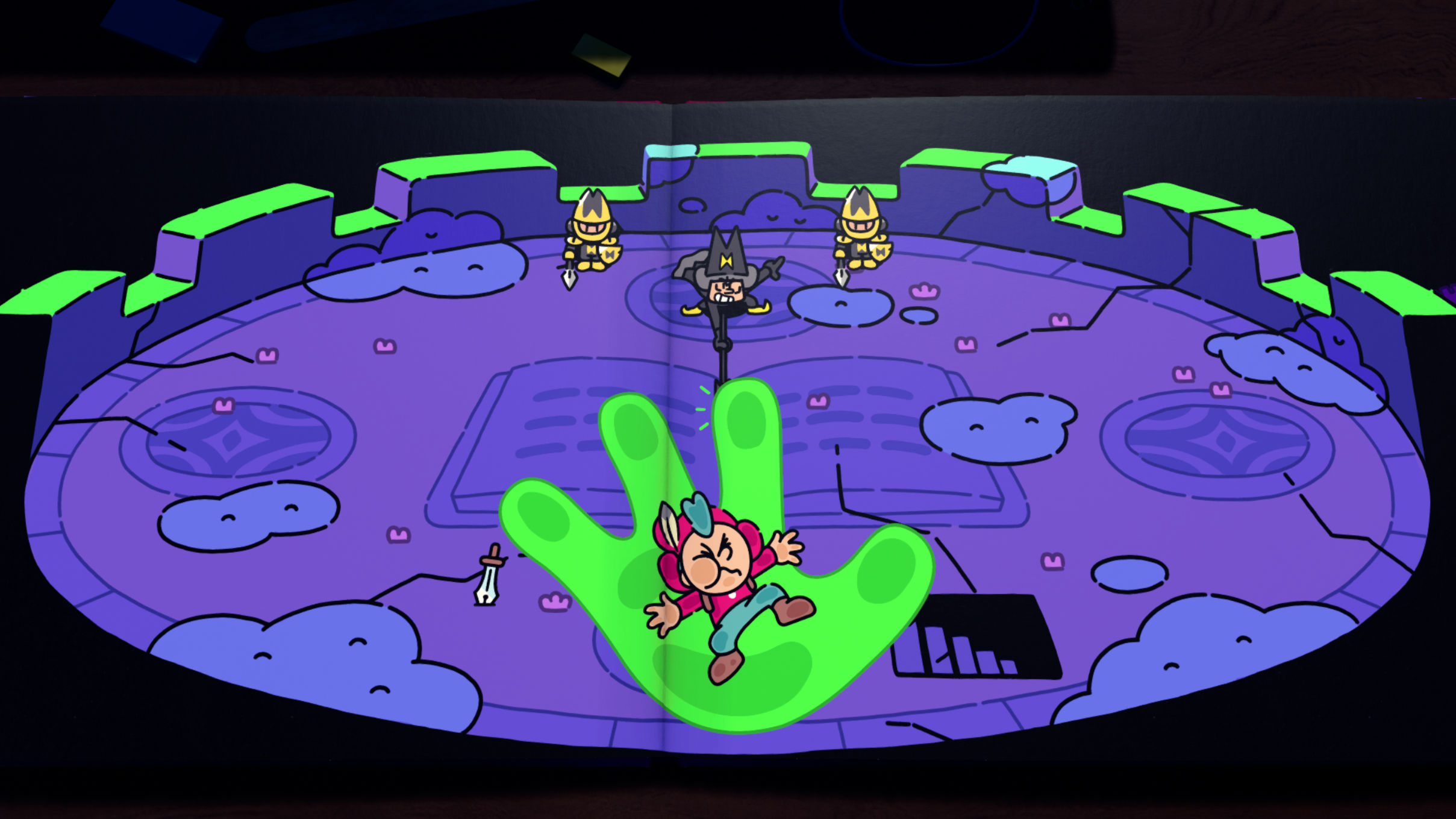 The Plucky Squire è piena di salti tra 2D e 3D e mini-sfide fantasiose. Nel gioco interpreti Jot, un giovane scudiero leale alle prese con un villain tutt’altro che contento del proprio ruolo: quando il malvagio Humgrump realizza di essere sempre destinato a perdere nella storia, espelle Jot fuori dalle pagine e stravolge il racconto. Da qui parte un’avventura in cui il nostro eroe deve saltare dentro e fuori dal libro, risolvendo puzzle per cambiare il mondo intorno a lui.