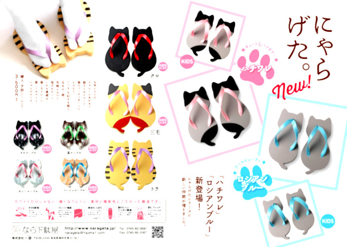 Amanti dei gatti è la vostra occasione: volete indossare dei sandali che esprimano la vostra passione felina? Rivolgetevi alla Nara Getaya, un produttore di geta (il sandalo tradizionale giapponese) con sede nella città di Nara che ha immesso in commercio una nuova linea battezzata Nyara Geta riprendendo l'onomatopea "nya" con cui si indica in giapponese il miagolio del gatto. La collezione completa è composta da nove diversi modelli con versioni sia per adulti che per bambini a 3.780 yen (circa 30 euro).