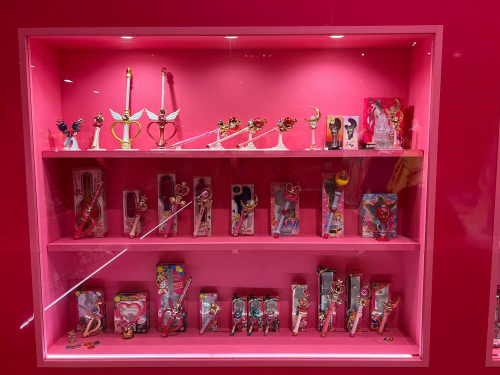 Al centro della stanza è stata collocata una macchina ride-on a gettoni con Sailor Moon seduta sopra. Tutt'intorno, custoditi in teche di vetro, tantissimi oggetti, a partire dai giocattoli (bacchette di plastica per bambini, peluche, bambole e persino una keytar a tema Sailor Moon) per arrivare a gioielli preziosi.