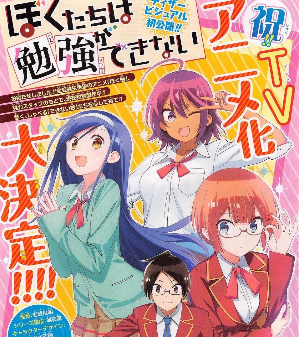 Anticipato nelle scorse settimane dall'avviso di un "importante annuncio" e dalla registrazione di un nuovo sito ufficiale e di un apposito account twitter, arriva ora dalle pagine di Shounen Jump l'avviso di un futuro adattamento anime per il manga Bokutachi wa Benkyou ga Dekinai di Taishi Tsutusui, attualmente in corso sulla stessa rivista di One Piece e Haikyuu!!.