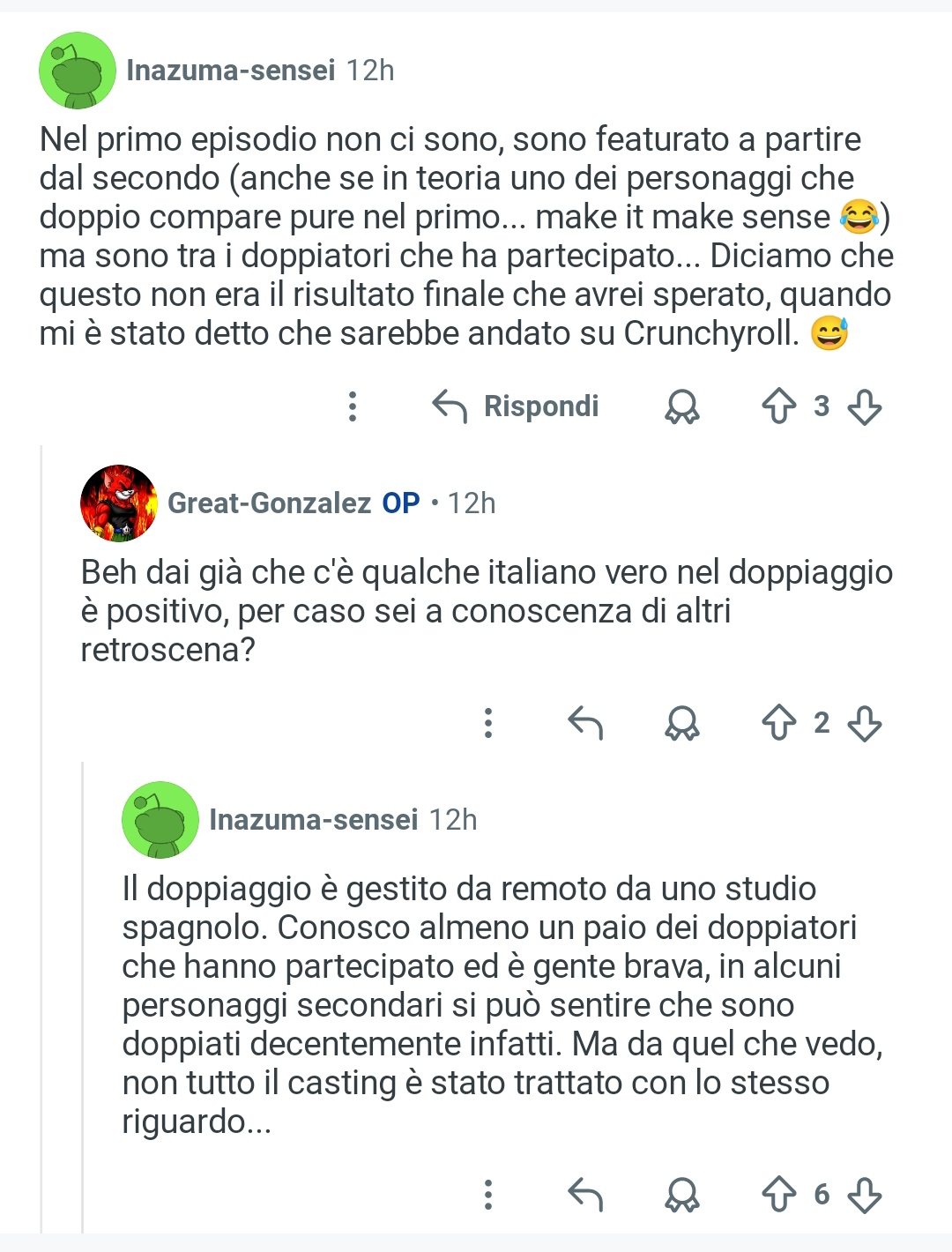 Comunque, stando a un commento al seguente link sembrerebbe che dietro ci sia stato un lavoro da remoto con uno studio spagnolo (se fosse vero in pratica si avrebbe di nuovo una situazione con gli ultimi doppiaggi italiani realizzati da Kazé): https://www.reddit.com/r/AnimeItaly/comments/1sumapo/doppiaggio_di_snowball_earth_cos%C3%A8_sta_schifezza/
